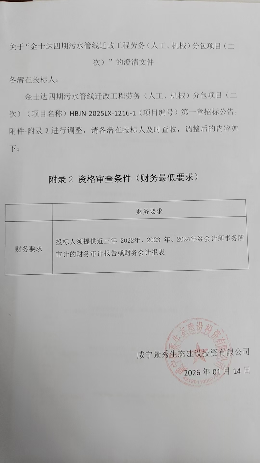 金士达四期污水管线迁改工程劳务(人工、机械)分包项目(二次)(项目名称)HBJN-2025LX-1216-1(项目编号)第一章招标公告,附件-附录2进行调整,请各潜在投标人及时查收,调整后的内容如下: